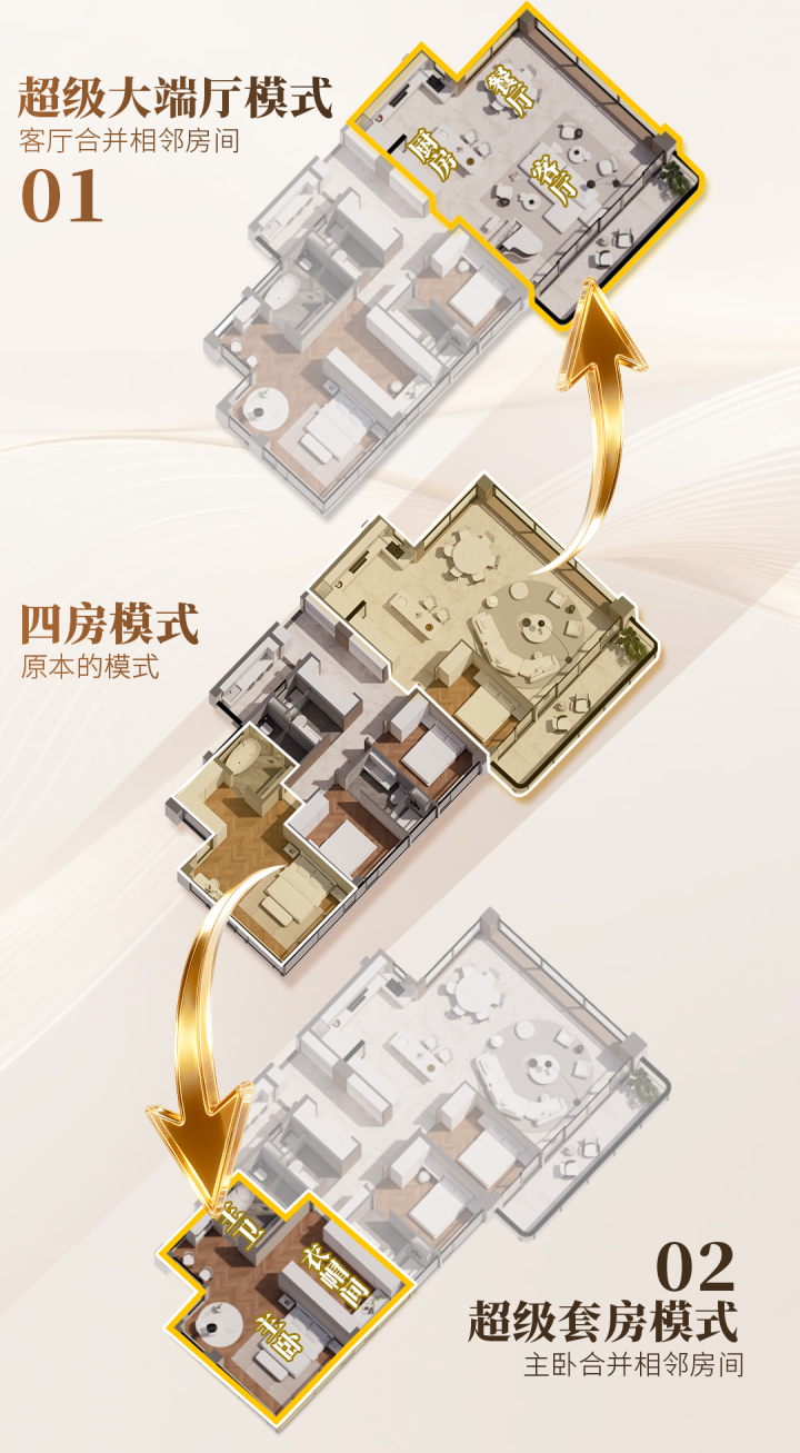 该户型,室内空间可随家庭成长或兴趣爱好自由重组,如果不需要那么多房间,可将客厅与相邻房间组合,形成约65㎡大端厅,会客从容有排面。