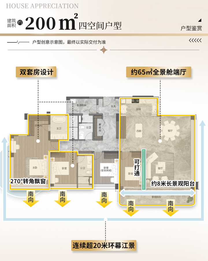 这个户型,四个房间全部朝南,通透对流,每个房间均享阳光与江风,实现家庭成员的“景观与通风平权”。