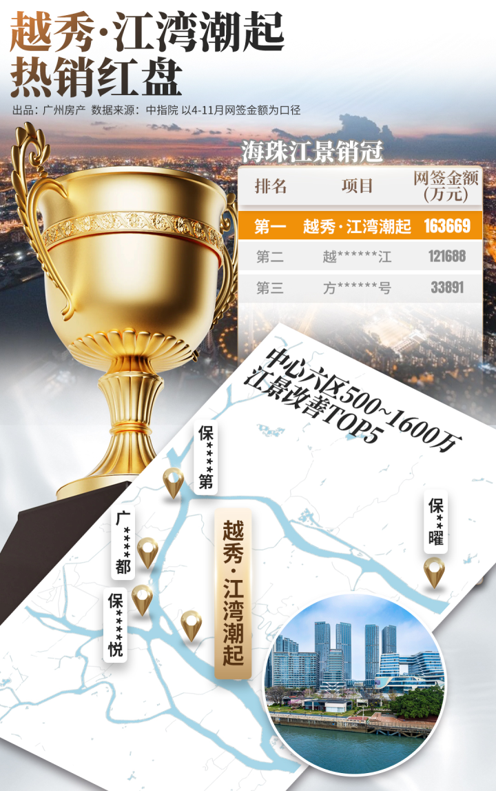 到如今,中指院数据显示,其网签金额登顶海珠江景销冠,中心六区总价500-1600万江景改善前三。
